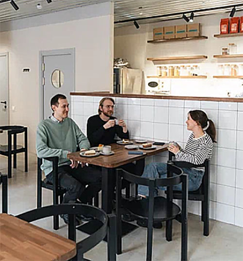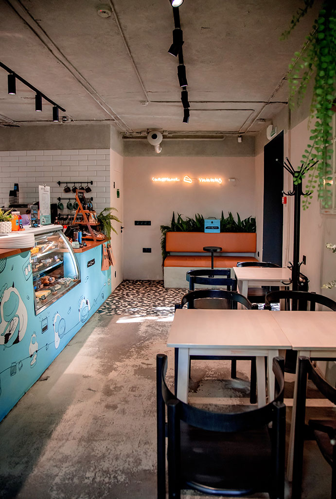 У нас можно расположиться за стойкой на высоких стульях возле панорамных окон, либо устроившись за столом, либо упасть на мягкий диван рядом с неоновой вывеской - всё как вам удобно и хочется.
